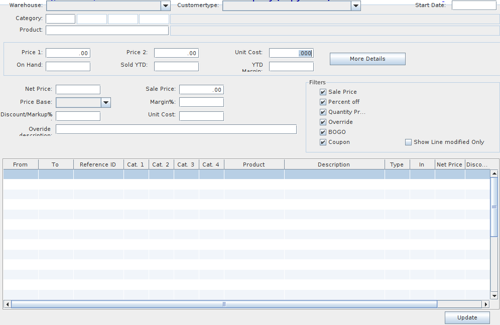 Once the user selected what type of search to perform, the user can click on update and the system will display the special prices based on the selected fields.