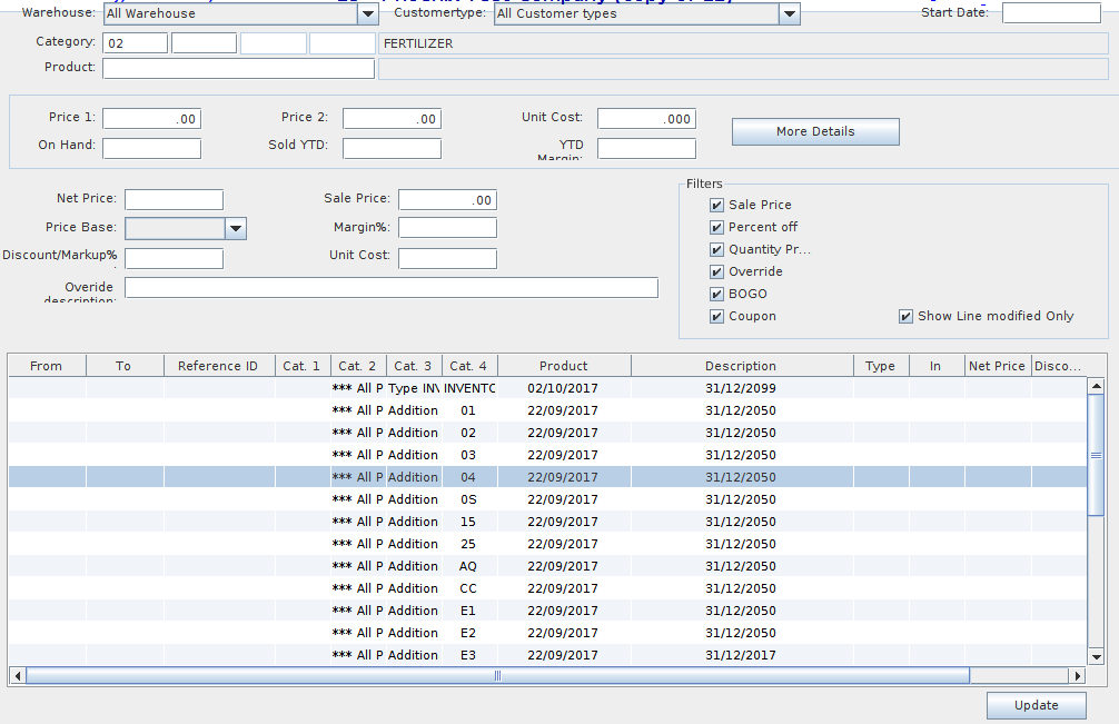 This Special Prices Multiple Search module allows the user to search for various special prices which were entered in the Phoenix software. This module is very flexible since the user can search for a specific special price using a search by warehouse, by customer type, by start date, by category, by specific product, by price 1 and 2, by net price, by sale price. The system also uses filters such as Sale Price, Percentage off, Quantity Pricing, Override, Bogo and Coupon.