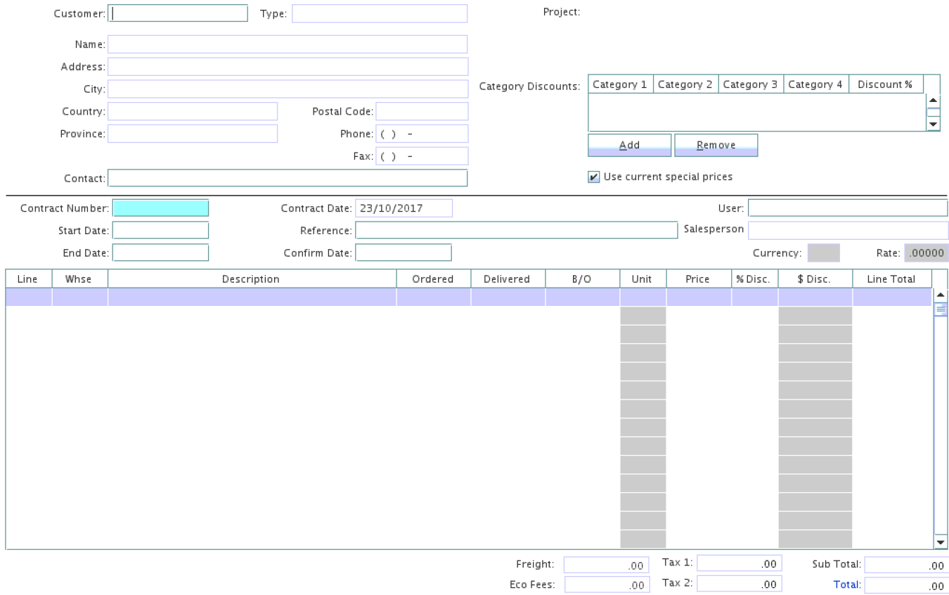 The Contract Maintenance module allows the user to create a Contract List for a customer when a customer and company negotiated a price for all the items that he requires for a certain project.