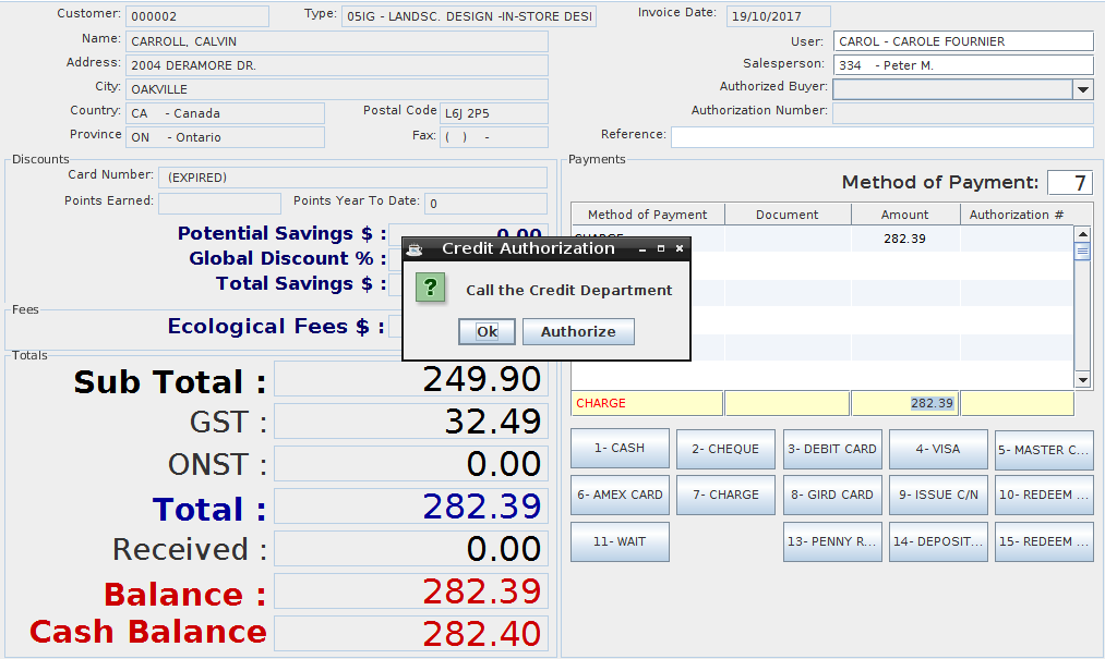 The user can click on OK once they received the authorization from the Credit Department and the sale will go through. If the user cannot reach the credit department to get authorization, it can be authorized by a manager by clicking on Authorize.