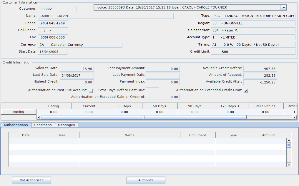 If the user cannot reach the credit department to get authorization, it can be authorized by a manager by clicking on Authorize.