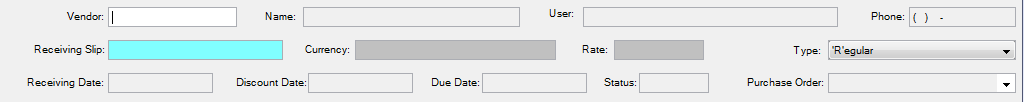Vendor: This field should be the Vendor required for the Receiving Slip being generated. By pressing F1 with the cursor in this field the user will be able to search for the vendor by keyword. When a Vendor is selected the name and phone number will appear automatically in the respective fields.