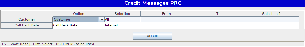 Customer: The user can select ALL or A Few customers to call back. If the user selects "a few", the user must enter a customer number under Selection 1.