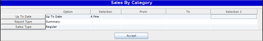 The Sales by Category report allows the user to print the Sales by Category with the following options: