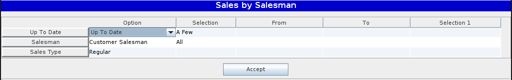 Salesman: The user must choose All - A Few or Interval from the pull-down list. If the user chose "a Few", the user must enter salesman(s) under the Selection area. If the user chose "Interval", the user must enter an interval under the From and To columns.