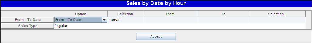 The Sales by date by Hour report allows the user to print the Sales by Date by Hour Report with the following options.