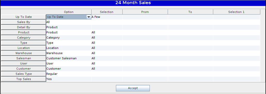 The 24 Month Sales report allows the user to print the 24 Month Sales Report with the following options.