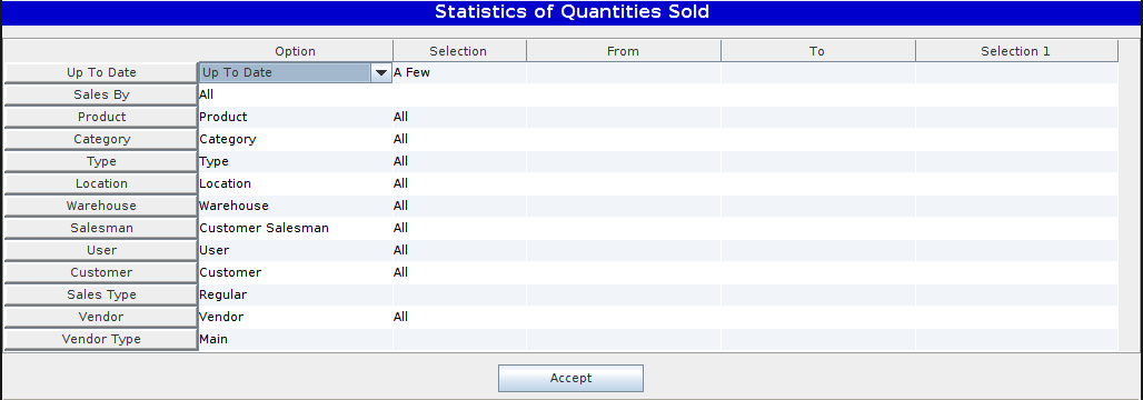 Sales Type: The user must choose Regular, Interco or Inventory. Regular would be Regular Sales which doesn't include Inter-co or Inventory Adjustments. Inter-co would only include Inter-company transfer. Inventory would only include Inventory Adjustments.