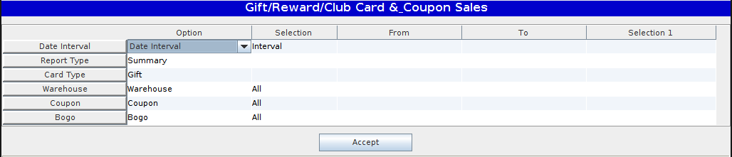 The Gift/Reward/Club/Coupons Sales report allows the user to print the Gift/Reward/Club/Coupons report with the following options: