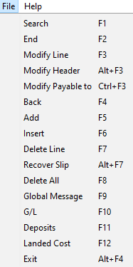 Deposits (F11): this function key is used to recall a deposit paid to the vendor specified on the Receiving Slip. All vendor deposits and their respective POs are tracked and viewable in the Purchase Order Deposits report.