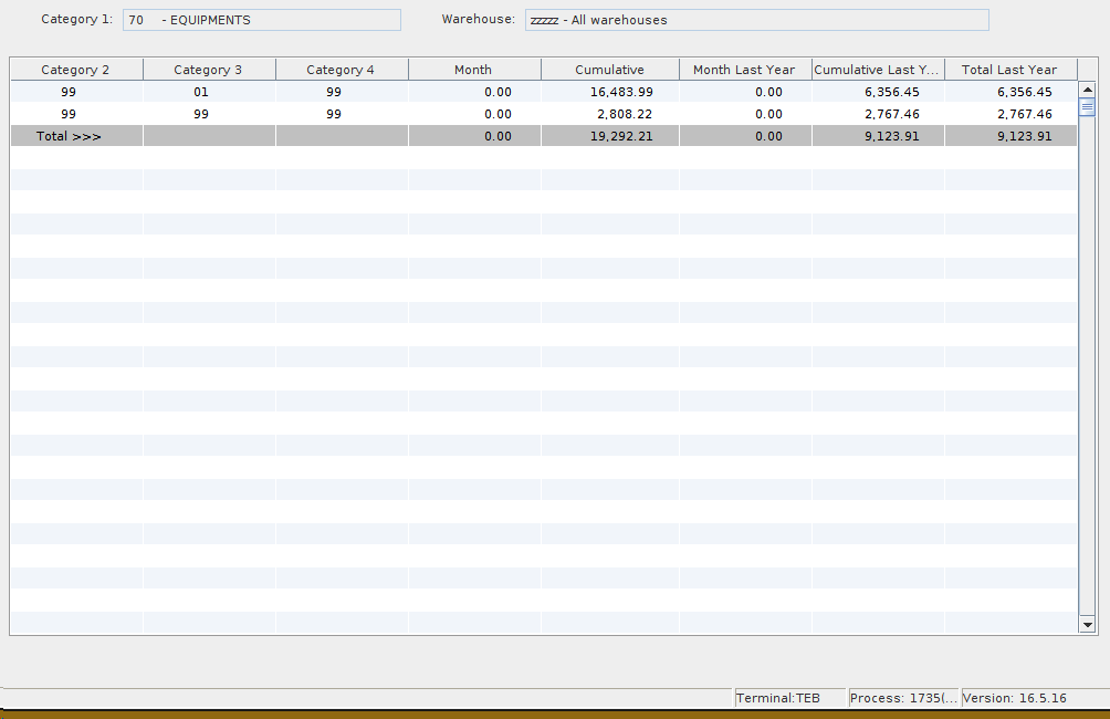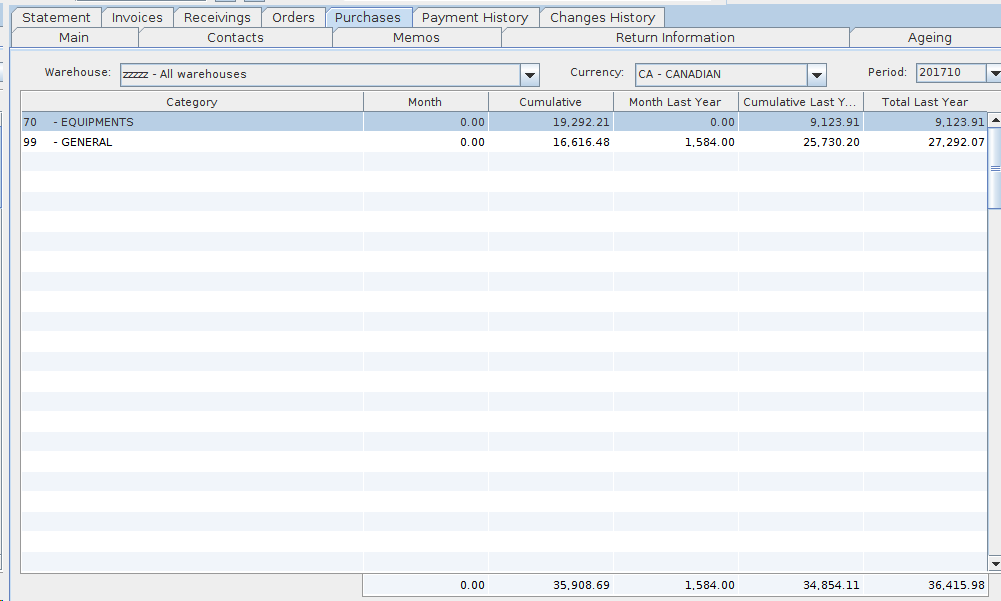 In the example above, by double clicking on Category 70 - Equipments, the system will generate a new tab with the expanded purchases by sub-categories related to Category 70 (see screen shot below). The total of each column should equal the total purchases of Category 70 presented in the main Purchase tab.