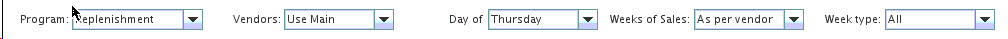 i.e: During the set up of an account in the vendor maintenance, the user specified the Day of Ordering for this vendor as Thursday. From the Products Reordering Analysis, the user selects Replenishment as a program, and specifies Thursday in the Day of field.