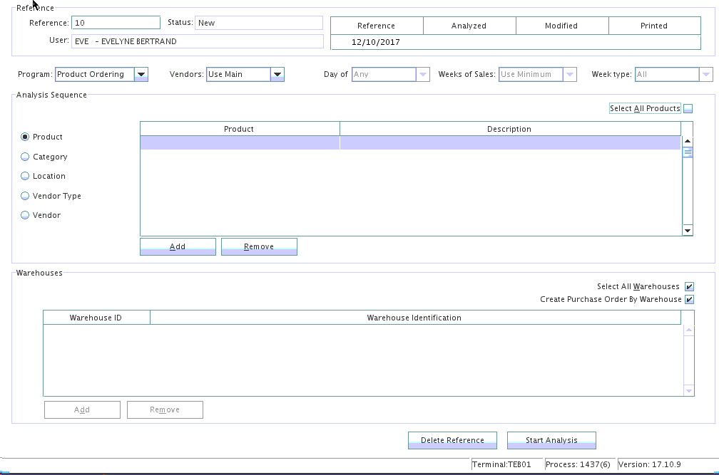 From this menu, the user will need to fill all of the fields explained below. Then once the user is done, by clicking Start Analysis, the system will generate an Analysis based on all options selected initially. The user will be able to make any modifications to the analysis - delete the analysis if needed and print the analysis once modified. By printing the analysis, this will generated a Purchase Order that can be recall, modified, and finalized from the Purchase Orders Entry.