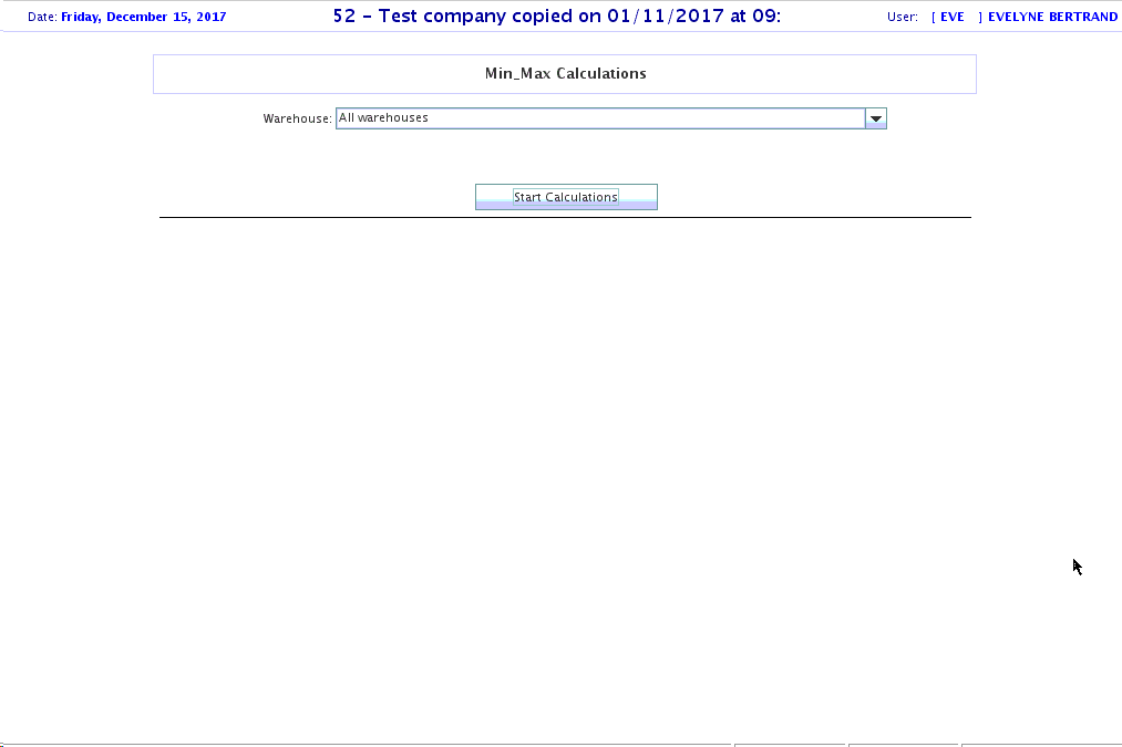 This screen is a tool that was designed to recalculate the Min/Max of all items for by warehouse of for all warehouse. The Min/Max will be calculate based on the Sales history of each item. Once the user click on Start calculations, the system will start the analysis and update the order information of each items from the Inventory Maintenance.