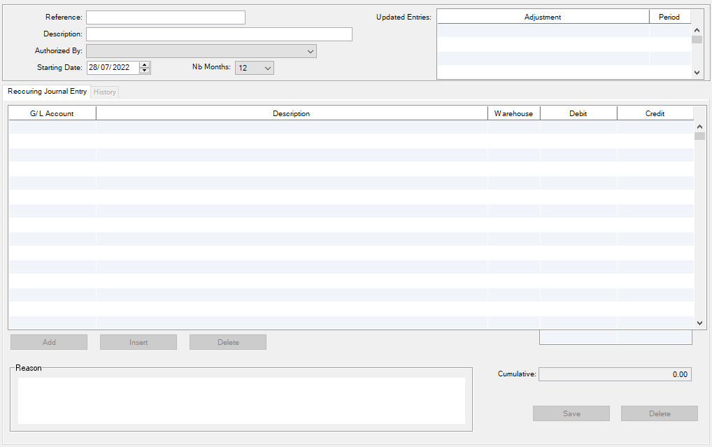 Reference: The user must enter a reference number for this recurring journal entry. This field is 20 digits and it is alpha-numerical.