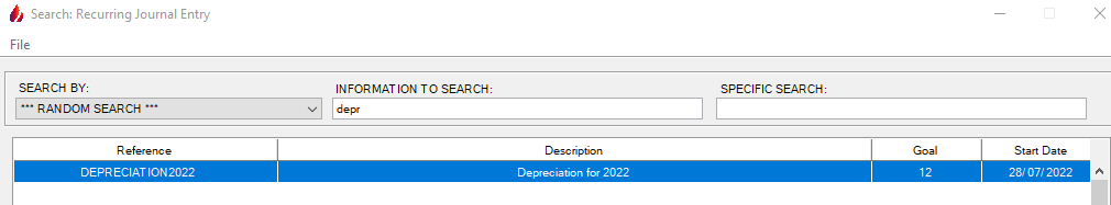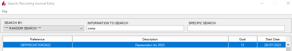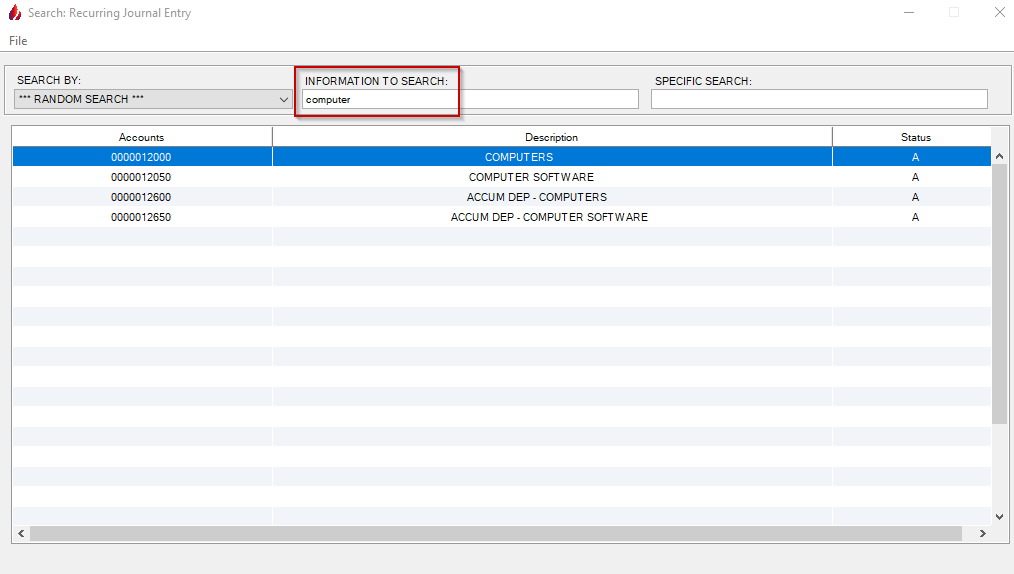 2nd Choice: The user can perform a search by pressing F1 and type in the information to help finding the proper recurring journal entry such as computer or depreciation as shown below: