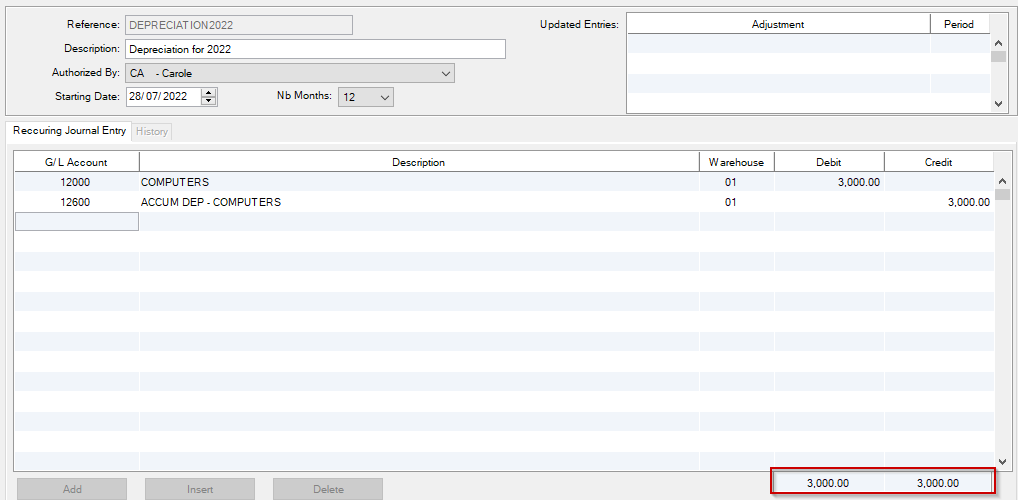 The user must select the account either by double clicking on the reference or the user can highlight the reference by using the arrows up and down and once highlighted, the user must press enter and this will bring the recurring journal entry on the screen to be viewed: