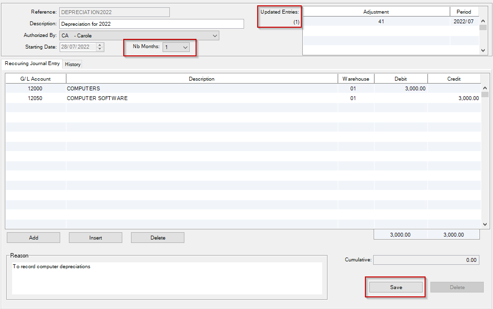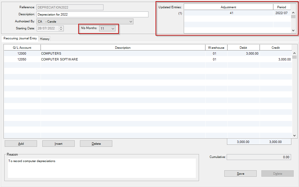 Nb Months: The user must choose the number of months for this recurring journal entry to be posted automatically at End of Month.