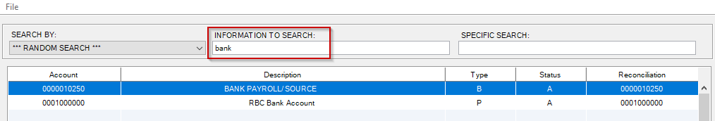 Account: Type in the bank account and press enter or perform a search (please see above instructions)