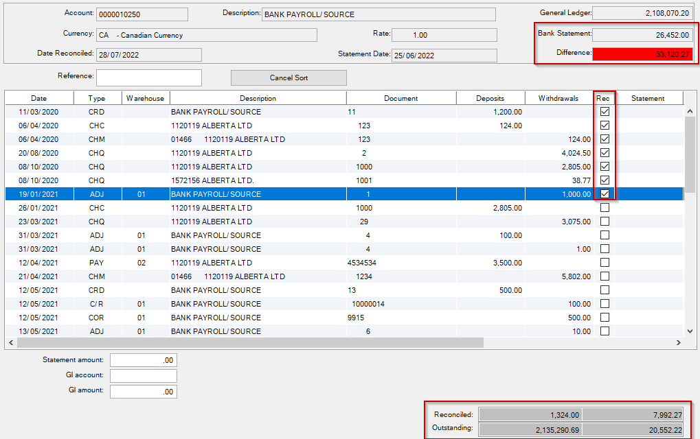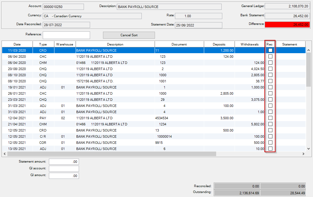 Once all the header is entered, the system will display the following screen with all the transactions found in the bank account number (i.e. 10250) until the statement date. The transactions that are not reconcile will show in this bank reconcile: