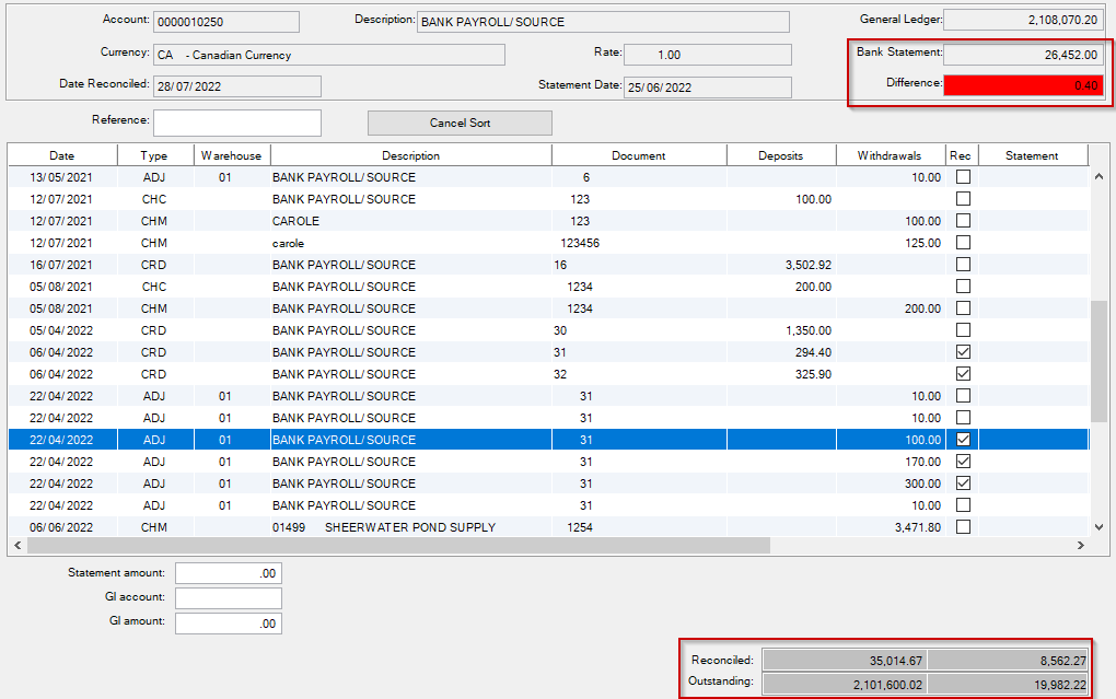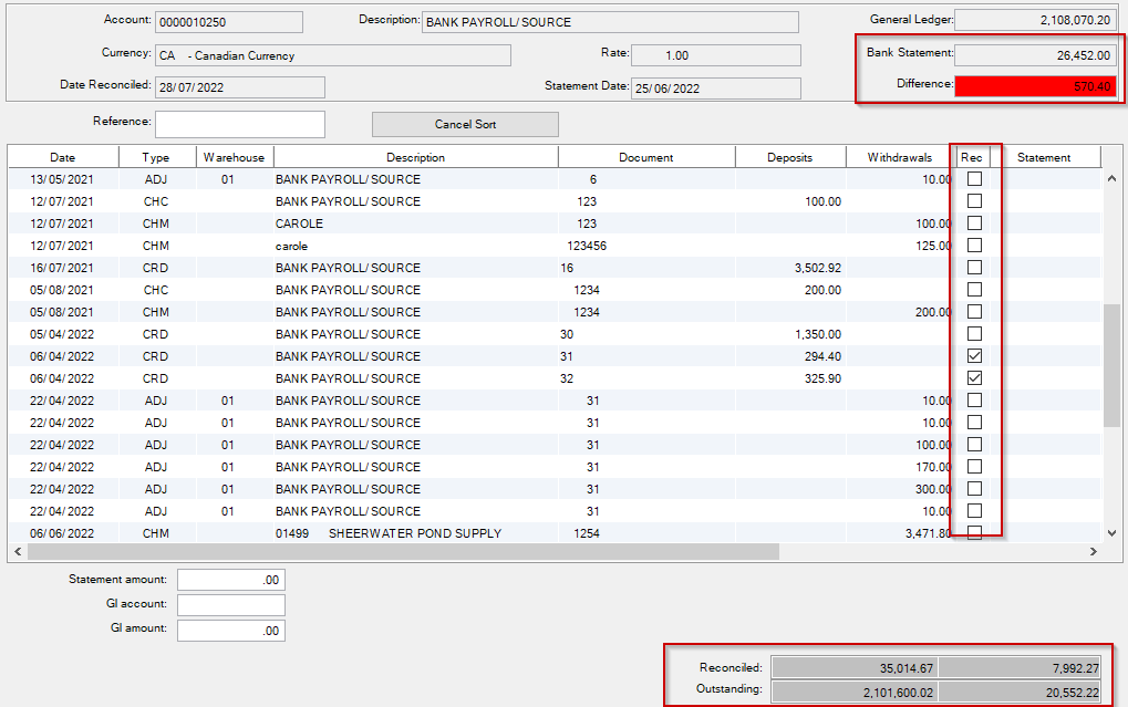 as the user clicks the transactions, the system will recalculate the reconciled amount and the difference as shown below: