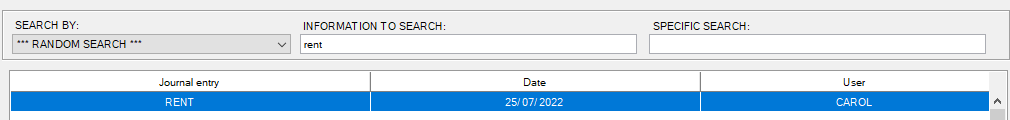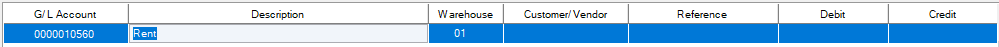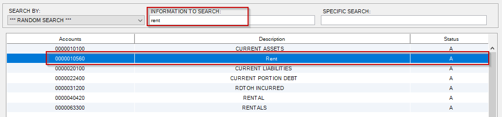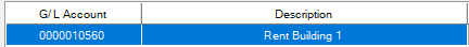 GL account: Once your cursor is under the GL account, the user can type in the account number directly or the user can perform a search by pressing the F1 key and typing some information to search such as rent: