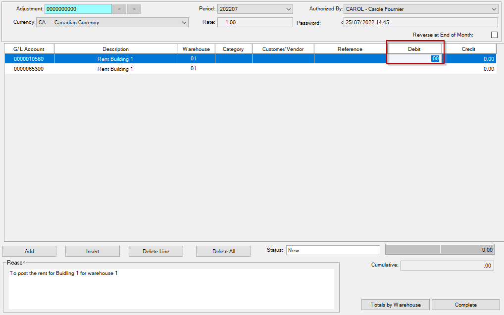Once all of the accounts are entered, the user must put in a Reason for this journal entry: