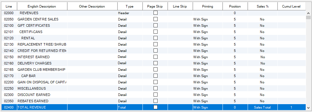 The first total line is at line 2400 and it has a level 1 so the system will add all of the detail lines above this line to create the total for the Total Revenue in this example.