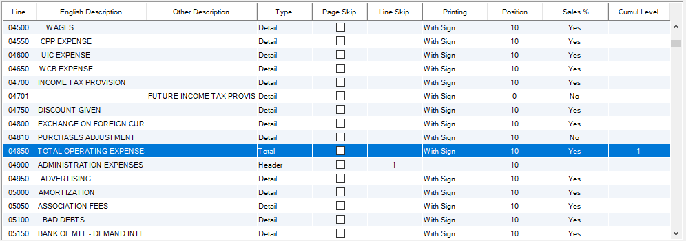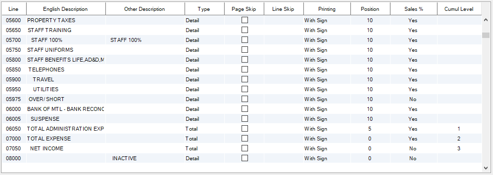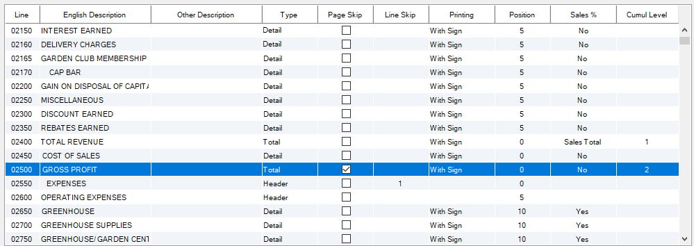 Cumulative level: The user must tell the system what section must be added together for the totals. The way it works is that a level 1 will stop at another level 1 but if you have a level 2, it will ad up all the detail of the accounts that are displayed above that number but will add lines with a level 1 but will stop at a level 2. So a level only adds the other totals if it is lower. So a 2 will add a 1 but will stop if it sees another 2 and a level 3 will add level 2 and 1 total lines but will not add a 3.