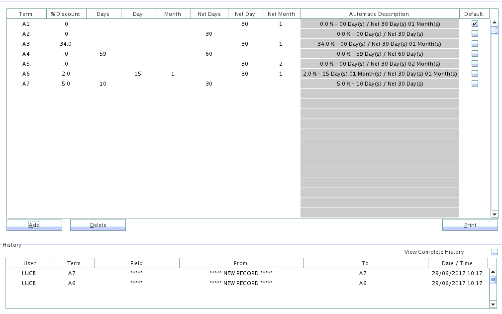 The user must decide which term will be the default by clicking the box at the end of the line which is called Default. This means that when a new account is created, this term will be the default one but can be overridden by selecting the proper term for the account from a drop down list.