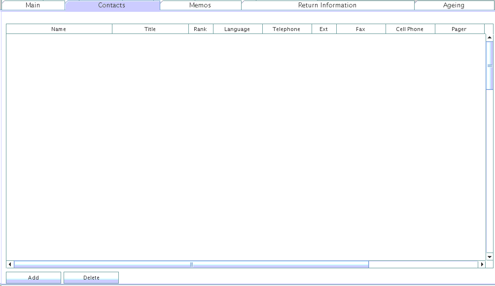 Once the vendor record is displayed on screen and the Contact Tab is chosen, a contact may be added by choosing the ADD button at the bottom of the screen. The cursor will go to the Name field and the user may key in the name they wish to record. The name field is alpha-numeric and may contain up to 20 characters. Press enter to proceed to the next field and key in the information in the appropriate fields. Once all information is complete, press Alt-F4 to exit and the system will prompt to save.