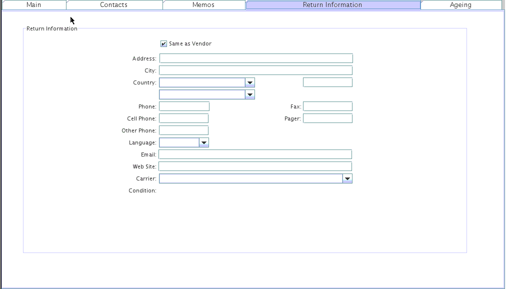If the Return Information is different than the Main Vendor Tab, then the fields on this screen should be completed with the appropriate information and the Same As Vendor check box should be left blank. In this case the information on the Return Information Tab will print on Return Documents.