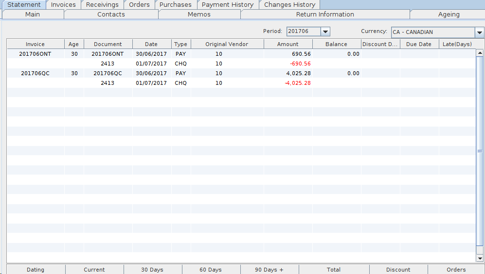 This Tab will display all invoices entered and payments made to a vendor during a given month. To view other periods, the user can select the period desired from the drop down list.