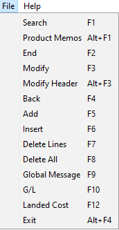 Exit (Atl+F4): This function key will close the Purchase Order entry module.