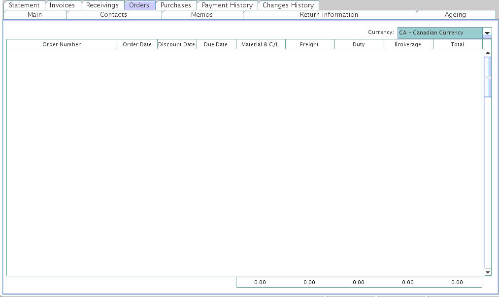 This screen will display all pending orders (Purchases Orders created and sent to the vendor, but not received yet) attached to the selected vendor. The Purchase order are sorted by date.