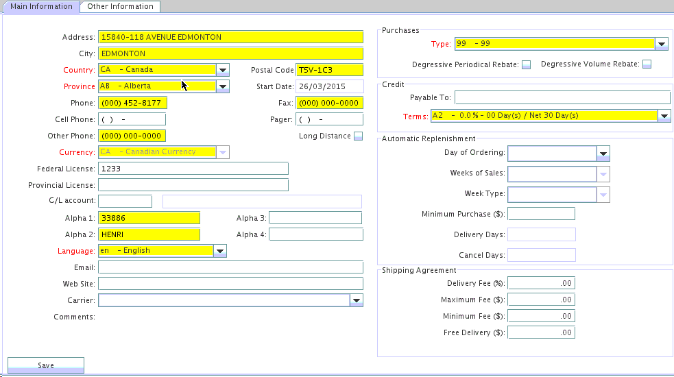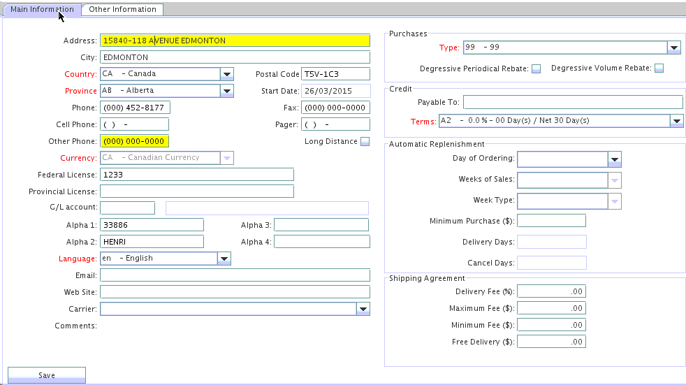 Lock All (Alt + f5): This function key may be used after a vendor file is displayed. This will lock almost all fields populated in the vendor file at the same time. It is used when creating a new vendor account that has the exact same information (i.e if a satellite account needs to be created on a main account with almost the same information). The locked fields (shown in yellow highlights) will be pasted into the new vendor record.