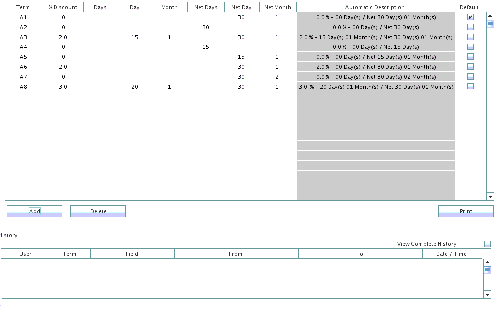 The user needs to decide which term will be the default by clicking the box on the right of the screen, labelled Default. This means that when a new account is created, this term will be the default one but can be overridden by selecting the proper term for the account from a drop down list.