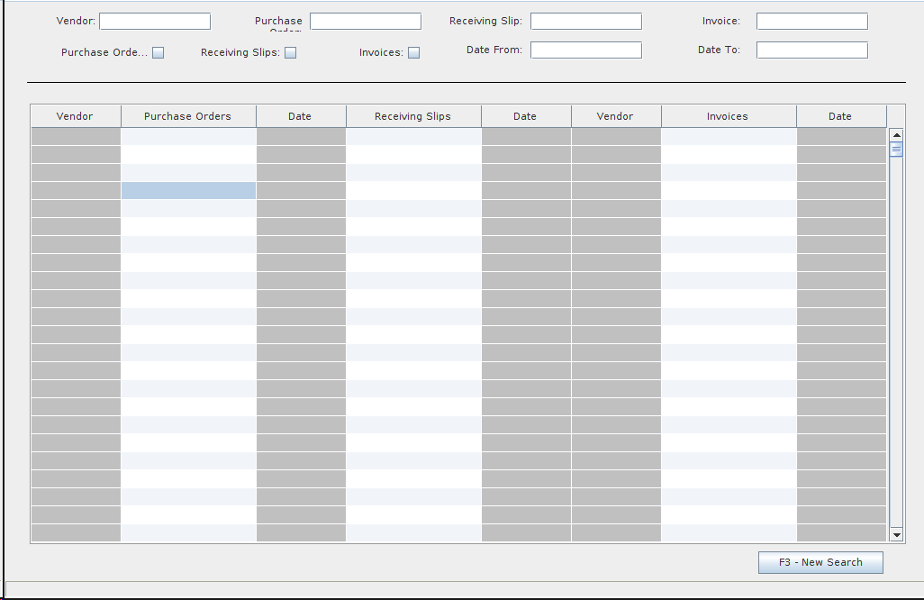 If all of the fields on the top row are left blank, or if a single Vendor is chosen, the system will require the user to select which type of documents are needed by checking the appropriate box(es) (Purchase Orders, Receiving Slips, Invoices) and by specifying a date range. Based on these input parameters, the system will search and display all documents that meet the criteria entered.